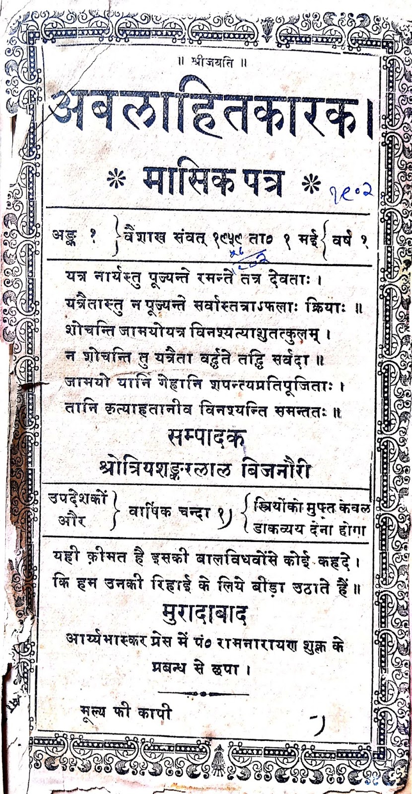 (अबलाहितकारक, मई 1903, अंक 1 : वर्ष 2).