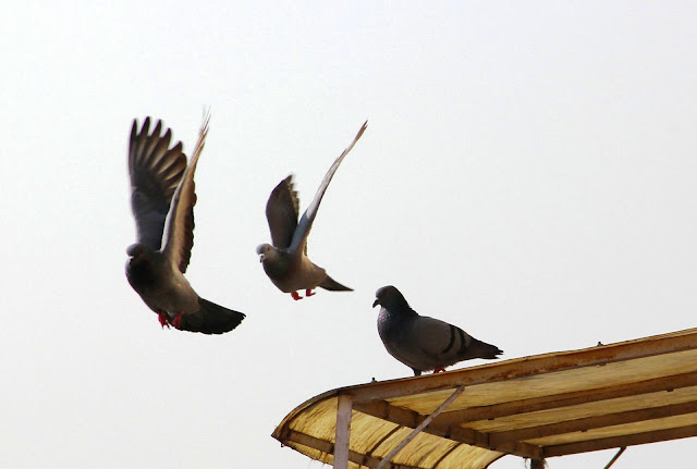 युगल बीच-बीच में आसमान की और सिर उठाकर कबूतरों का उड़ना देख रहा है.