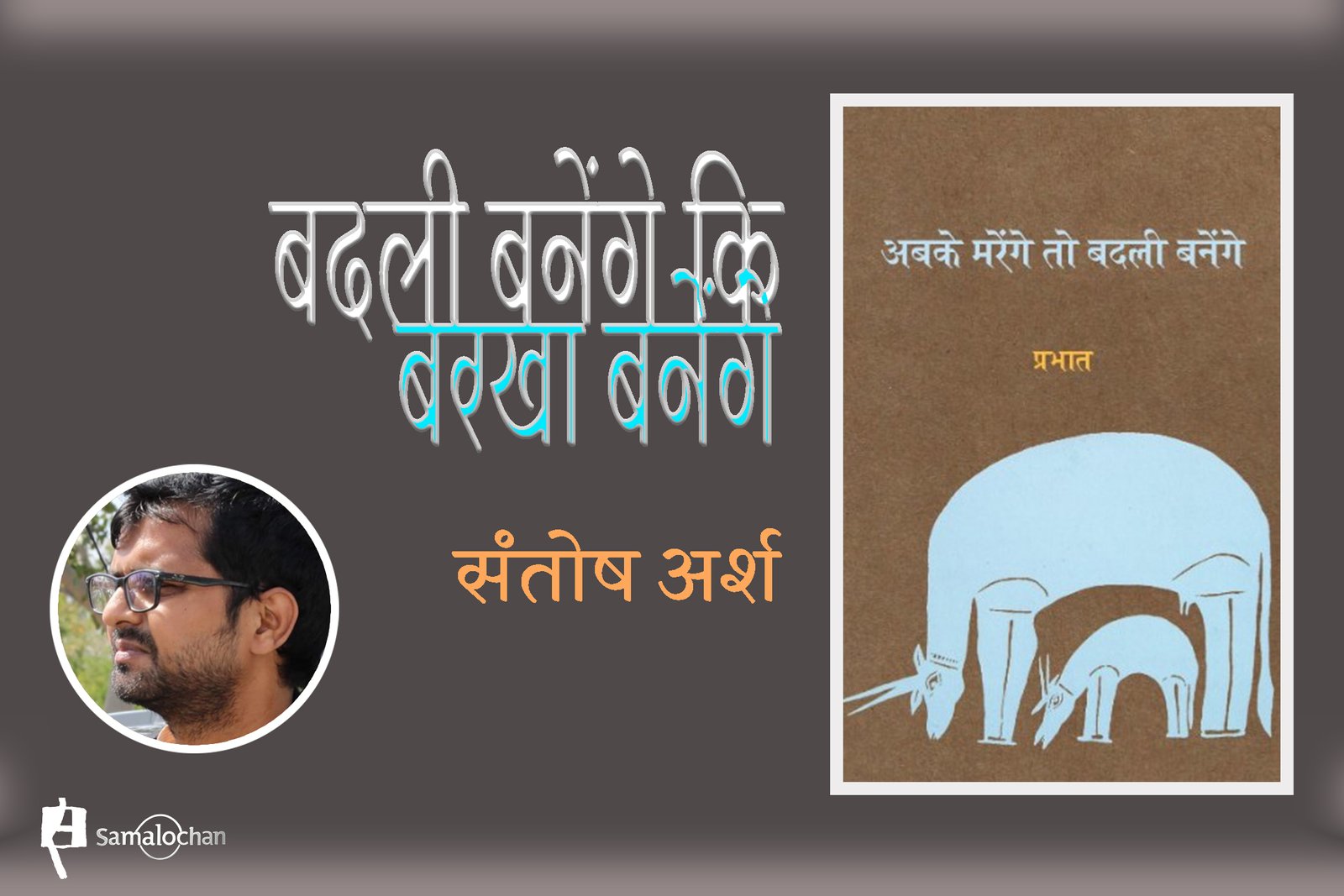 प्रभात के नये संग्रह ‘अबके मरेंगे तो बदली बनेंगे’ में कुछ पुरानी कविताएँ भी संकलित हैं, किन्तु संग्रह के नयेपन के साथ पुराने संग्रहों ‘अपनों में नहीं रह पाने का गीत’ और ‘जीवन के दिन’ की अनुगूँजों को सुनने की चेष्टाओं के मध्य उनकी कविताई की सुसंगति की एक सरल रेखा खिंचती चली जाती है. जब हम प्रभात को आधुनिक हिन्दी कविता की परम्परा से जोड़ते हैं तो उसकी बुनियाद में प्रगतिवादी कविता की चन्दनवर्णी धूल के फूल खिलते हैं और नवें दशक की लोकाभिमुख मेड़ पर बैठे कवियों की पाँत का उनकी कविताई अभिवादन करती हुयी सी जान पड़ती है. बावज़ूद इसके हम उन्हें कविता की थोड़ी अलग-सी ज़मीन पर खड़ा हुआ देखते हैं तो वह स्मृति का जादू है. इस जादू में सादा-सूक्ष्म अनुभूतियों और लोक-जीवन के सौन्दर्य को मूर्त कर देने की देसी कारीगरी है. देशजता का शिल्प है. मनुष्यता की सुरीली धुन, यातना का करुण राग और लघुमानव की जीवन-लय से निर्मित संगीत की संगत है. उसी जीवन के अमूल्य सौन्दर्य के महावृक्ष पर प्रभात किसी मनौती की तरह कविता-पंक्ति बाँध देते हैं :